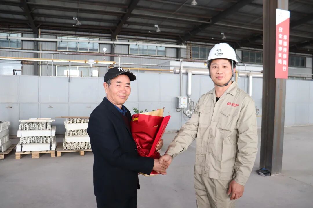 在温馨的薪火传承环节,青年技术骨干管宇作为徒弟代表,向恩师敬献鲜花,师徒并肩定格传承瞬间,象征着菲力工匠精神接续传递、生生不息。
