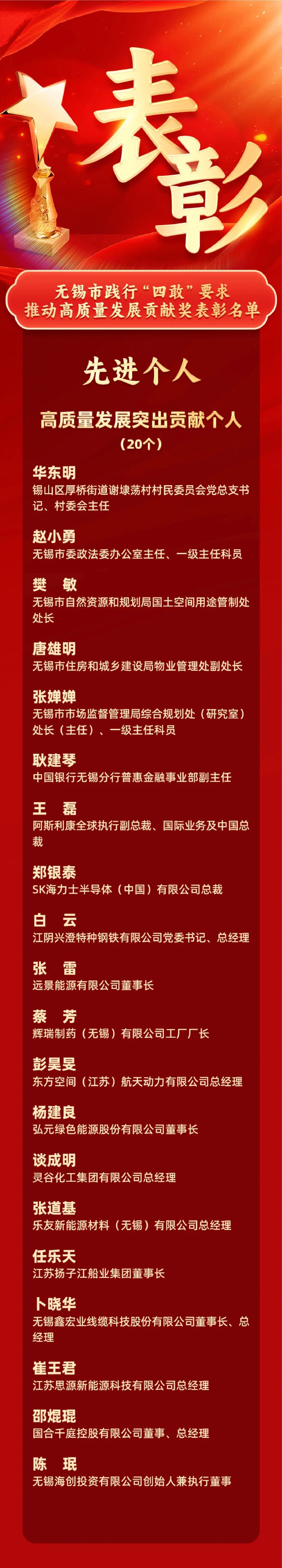 会上公布了无锡市2023年度高质量发展综合考核光荣榜、无锡市践行“四敢”要求、推动高质量发展贡献奖表彰名单。阿斯利康全球执行副总裁、国际业务及中国总裁王磊、SK海力士半导体(中国)有限公司总裁郑银泰、远景能源有限公司董事长张雷、灵谷化工集团有限公司总经理谈成明、国合基地董事总经理邵焜琨等荣获“2023年度高质量发展突出贡献个人”称号。