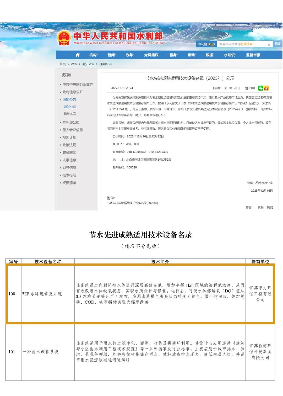 近日,水利部公布了最新一批节水先进成熟适用技术设备名录,国合基地生态链企业江苏菲力环保工程有限公司的WEP水环境修复系统凭借卓越的技术性能、显著的治理成效成功入选,标志着该系统在水环境治理领域的技术先进性与应用可行性获得国家权威部门的高度认可,为我国水库水源地生态修复与节水护水工作注入强劲动力。